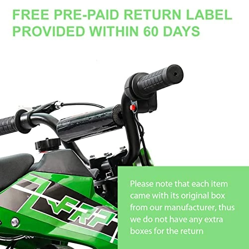 - ????️ FRP DB002 KID DIRT BIKE DIMENSIONS: This 50cc dirt bike supports weight up to 165.3 lbs with dimensions of 38″L x 22″W x 27″H. Please do not hesitate to contact us through Amazon Message if you would like to return your mini dirt bike within 60 days warranty period, we are pleased to issue you PRE-PAID FREE RETURN LABEL for your satisfaction.