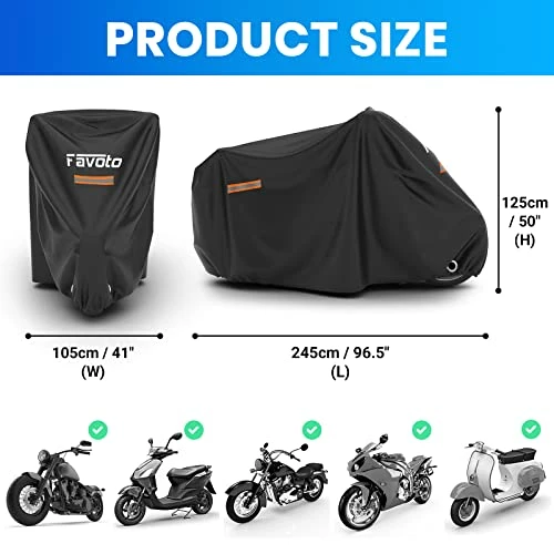 - [ UNIVERSAL FIT ] – Favoto motorcycle cover is universal and fits various motorcycles. Fits up to 96.5” in length motorcycles.