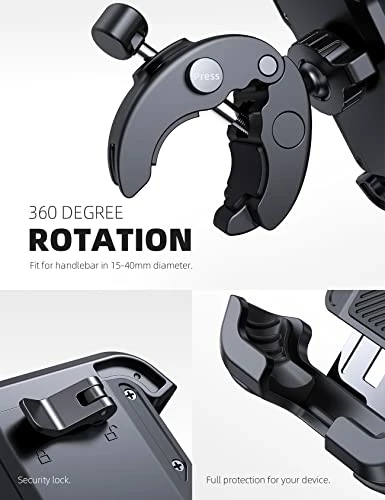 - 【 360 Degrees Rotating】 The adjustable motorcycle cell phone mount comes with a 360 degrees rotation ball, allows you to freely adjust the angle during riding. With this 360-degree rotatable phone clip, you can easy to adjust your cellphone to the viewing angle to horizontal or vertical, help use your phone to do GPS position/ have calling/ play music conveniently during riding.