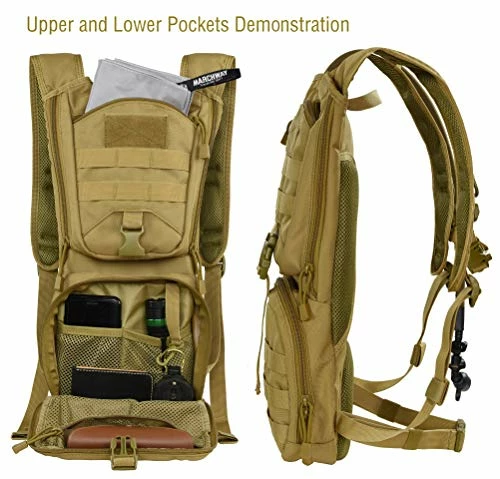 - Practical Functions: 1 main pocket fits up to 3L water reservoir with either large or small opening. 2 external pockets for storing personal belongings wallet, gadget, towel, phone, keys. The MOLLE system allows you to carry more items.