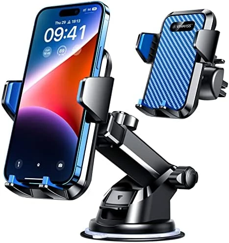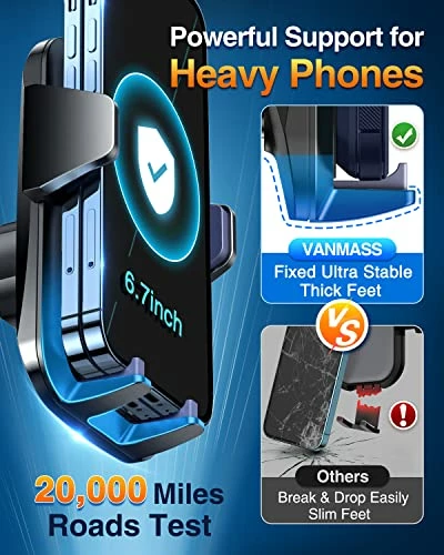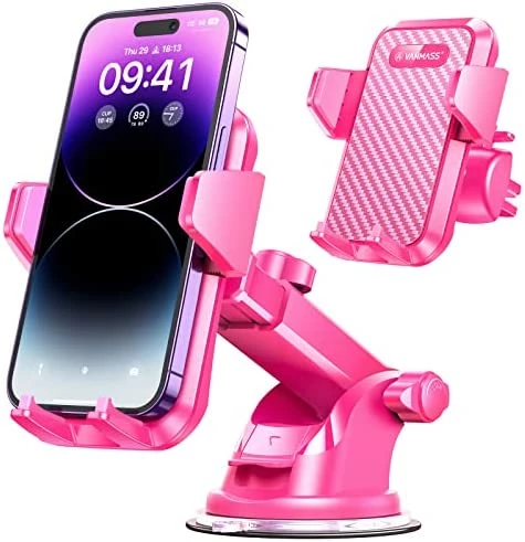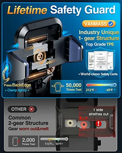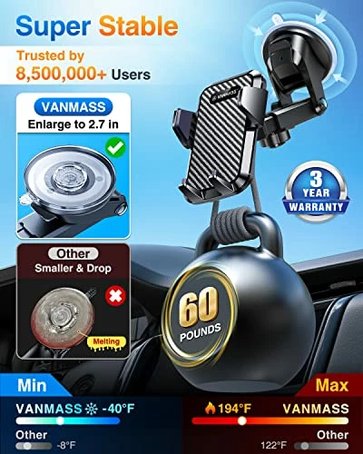 - 【Patented Multi-scene Design: Car/Desk/Kitchen/Bathroom/Gym】VANMASS car phone holder brings sticky suction cup & steel-cored vent clip from 3000+ surveys. Ideal present for your specials. Luxury look & structure was certified by RoHS, CP65, REACH.