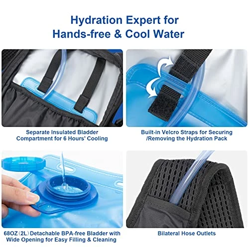 - HANDS FREE DRINKING — This Hydration Backpack comes with 2-Liter water bladder & bilateral hose outlets designed to free your hands. A separate inuslated bladder compartment for 6 Hours’ Cooling(with ice packs) . The 2-Liter bladder is replaceable and supports up to 3-Liter.
