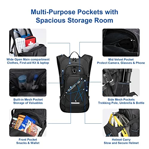 - UTMOST STORAGE CAPACITY: 10.5-inch large opening 18-Liter main compartment to fit clothes/notebook/first-aid kit/kids’ stuff. Built-in mesh pocket for personal valuables. Exterior upper velvet pocket perfect for protecting cameras, mobile phones. Trekking poles, extra water bottle in the side mesh pockets for easy access. Helmet carry in the deployable overflow pocket.. Don’t worry, the EVERFUN Hydration backpack has the utmost storage capacity for you and your kids’ stuff.