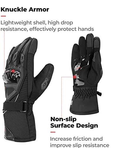 - HARD ARMOUR – The motorcycle winter gloves for men designed with the hard plastic armour on the back of the hand. They are very stable and well thought out with the extra defend on the knuckles. To avoid your hands from bumps and abrasions when falling.