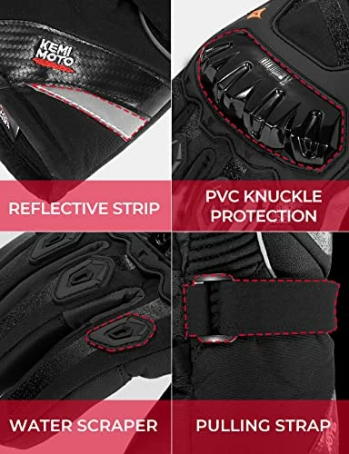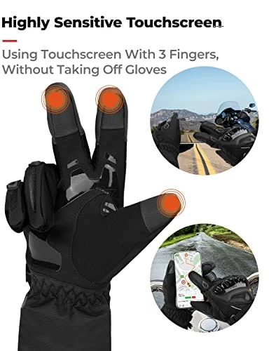 - THREE FINGERS TOUCHSCREEN – The tip of the forefinger, middle, and thumb of the winter motorcycle gloves are made from conductive touch screen leather. So you can do everything without restriction, even if you wear gloves, you can still use the mobile phone or navigation device easily.